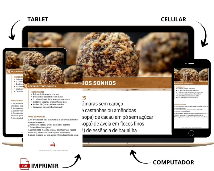 Ideal para você que deseja ter à mão receitas fit saudáveis para o dia todo. O que você recebe: